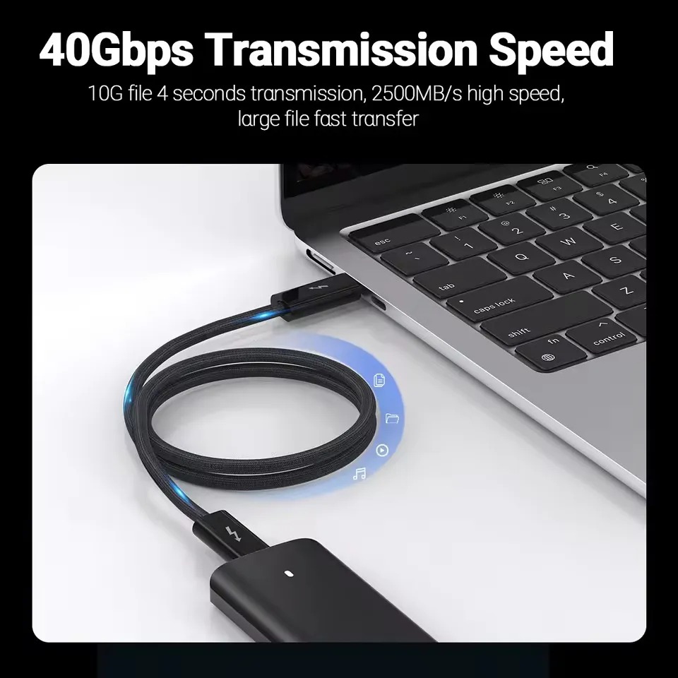 Transmissão de dados em alta velocidadeexperimente uma transferência de dados extremamente rápida com uma interface USB4 de 40 Gbps, perfeita para mídia de alta resolução e arquivos grandes.Compatibilidade versátilcompatibilidade universal com dispositivos USB-C, suportando transferência de dados, carregamento rápido e saída de vídeo 8K.Capacidade de carregamento rápidocarregue seus dispositivos rapidamente com o recurso de carregamento de alta velocidade PD 240W, garantindo que seus dispositivos estejam prontos para uso rapidamente.Design compacto e portátilO design compacto de 5 polegadas/13 cm o torna ideal para viagens, cabendo perfeitamente em seu chaveiro para fácil acesso em qualquer lugar.Construção durávelApresentando um interior FPC (circuito impresso flexível) flexível, este cabo oferece durabilidade superior em comparação aos modelos padrão.Seja compatível com Thunderbolt 3, Thunderbolt 2, USB3.2/3.1/3.0/2.0Somente o host, o cabo e os dispositivos conectados suportam o protocolo thunder, então a velocidade teórica de 40Gbps é alcançada.Somente monitores e computadores com porta USB-C e porta Thunderbolt 3 são suportados.Como alcançar a resolução de 8K/60Hz