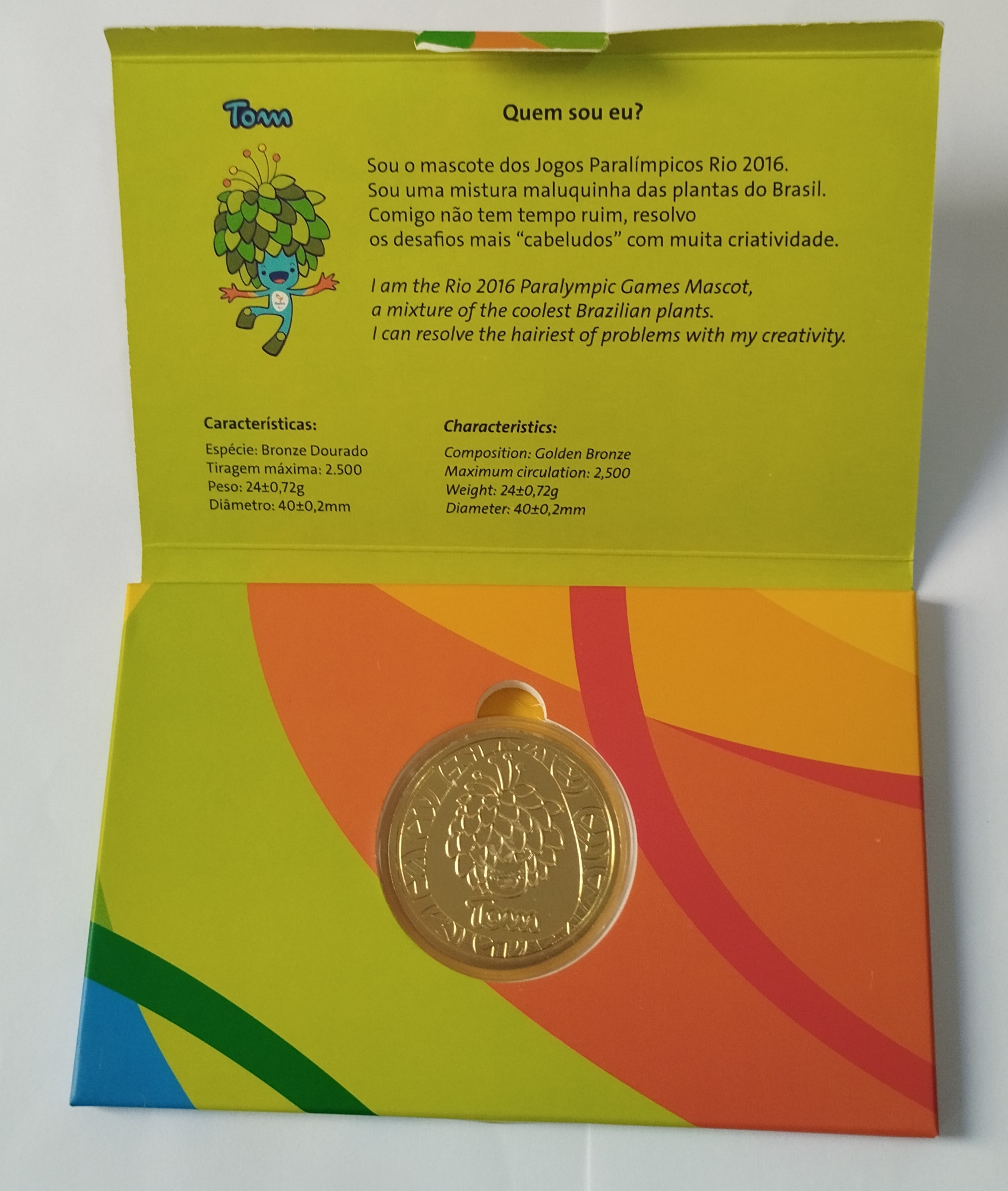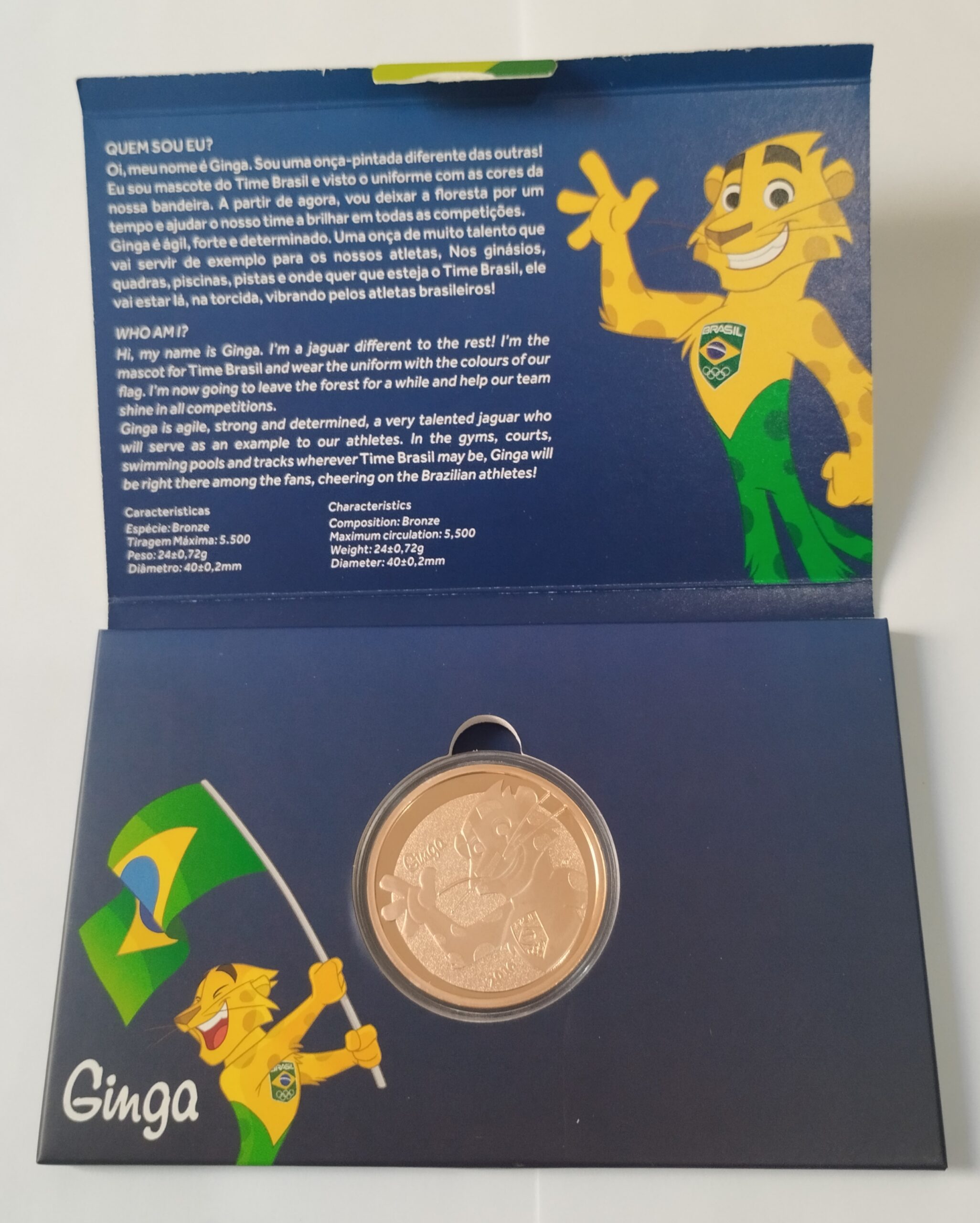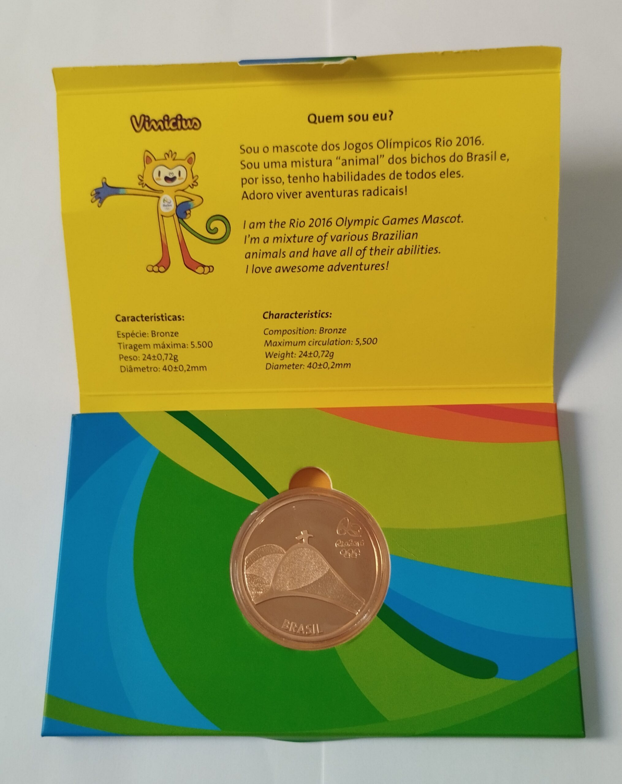JOGOS OLIMPICOS RIO 2016 MEDALHA DO MASCOTE VINICIUS EM BRONZE POLIDO LACRADO EM CASULO E ESTOJO ORIGINAL DA CASA DA MOEDA! BELISSIMO!